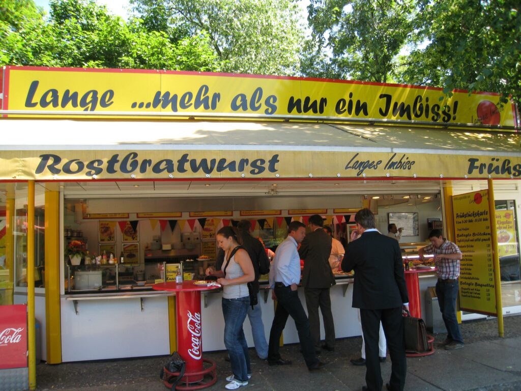 L'Imbiss est un stand de snacks allemand—pas un restaurant—où vous mangez debout à des tables hautes. Il sert de la nourriture rapide utilitaire, grasse et salée : frites, saucisses (bratwurst, currywurst), boulettes de viande (Frikadellen) et sandwiches au schnitzel. L'objectif est de vous faire avancer, pas de vous asseoir et de traîner. C'est rapide, bon marché (3-6 €), et une infrastructure essentielle pour la classe ouvrière. Vous commandez au guichet, mangez rapidement et partez.