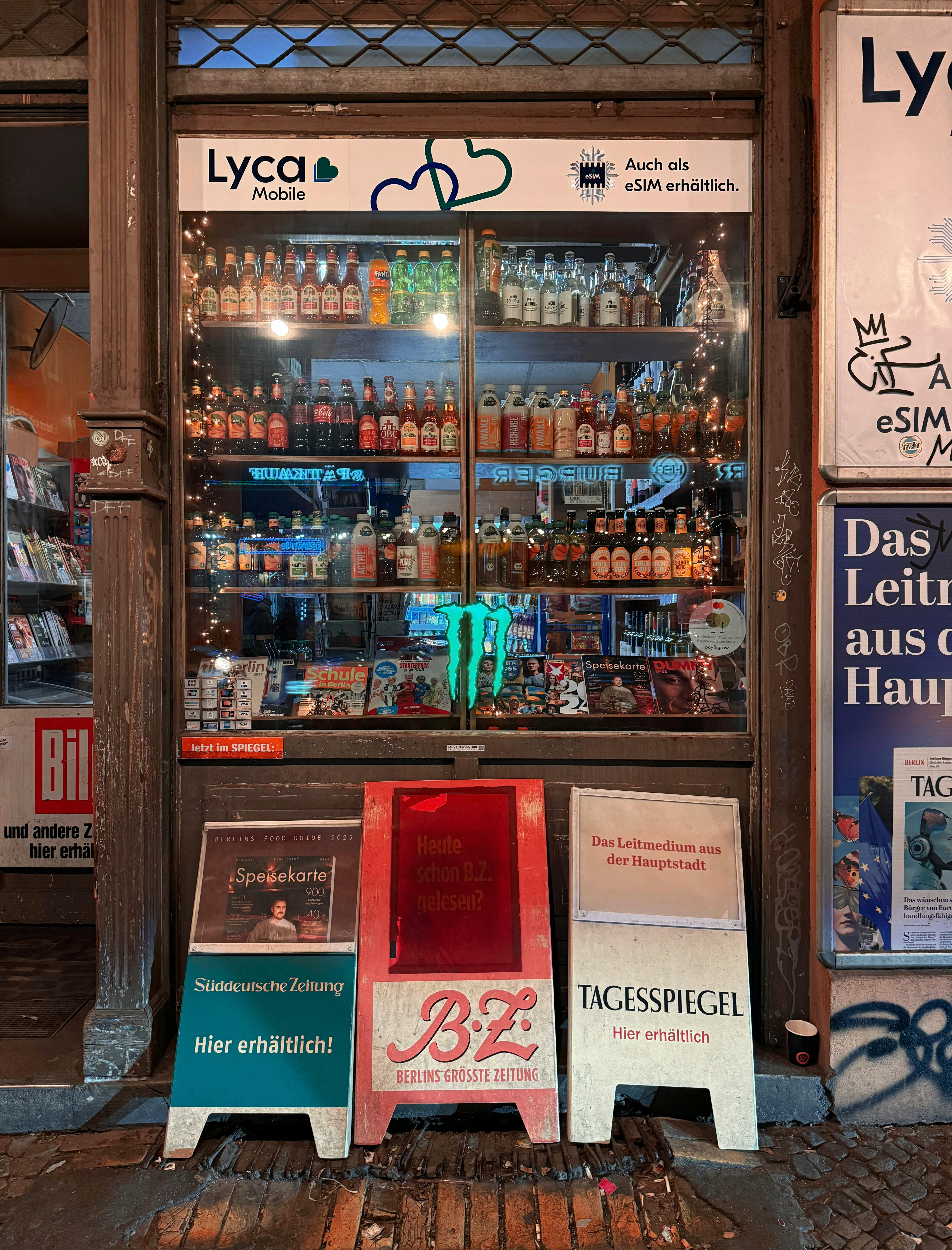 Le Späti (Spätkauf) est un magasin de quartier ouvert tard dans la nuit jusqu'à 2h du matin ou plus, soutenant l'économie nocturne de Berlin avec de la nourriture de survie : pizzas surgelées, nouilles instantanées, chips, barres chocolatées, boissons énergétiques et bière froide. C'est ainsi que vous survivez à 4h du matin quand tout le reste est fermé et que vous êtes trop fauché ou paresseux pour un restaurant. Les Spätis sont le cœur social des quartiers : achetez une bière et asseyez-vous sur le banc à l'extérieur avec les habitants.